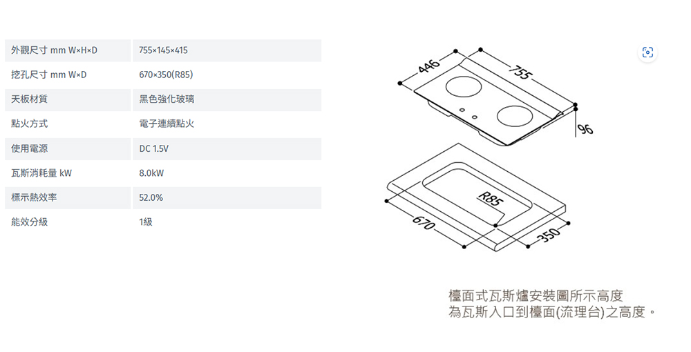 日本專利內焰爐頭火焰更集中 火焰集中,高保溫性與保水性 一級能效,省能高熱效 平整化吸氣遮罩爐面更美觀 輕量化鑄鐵爐架 不銹鋼雙層湯盤承接灑落湯水,方便易清潔 LED藍光旋鈕,火力大小可視化 警示紅光設計,異常熄火紅燈顯示,提升安全性 熄火安全裝置 商檢登錄字號:R41095