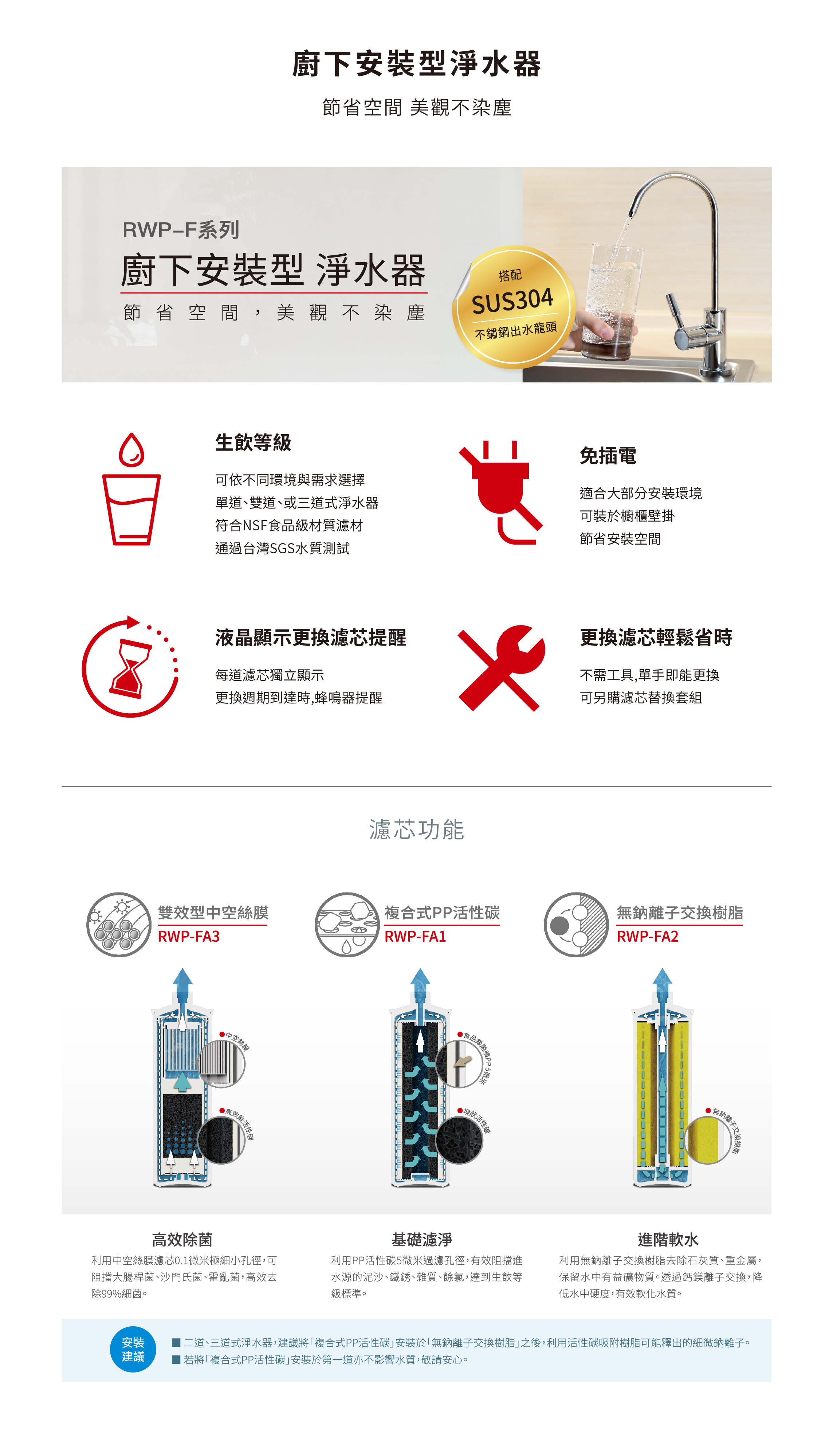 廚下型安裝,美觀又節省空間 基礎到進階過濾,滿足各種需求 蜂鳴器主動提醒更換濾心 搭配SUS#304不鏽鋼出水龍頭 開水即濾,減少儲水造成的二次汙染 符合美國NSF食品級材質濾材,通過台灣SGS水質測試 ●淨水功能:1.基礎濾淨 2.進階軟水(RWP-FA1 複合式PP活性碳/RWP-FA2 無鈉離子交換樹脂) ●濾芯建議替換週期6個月(依各地自來水不同略有差異)