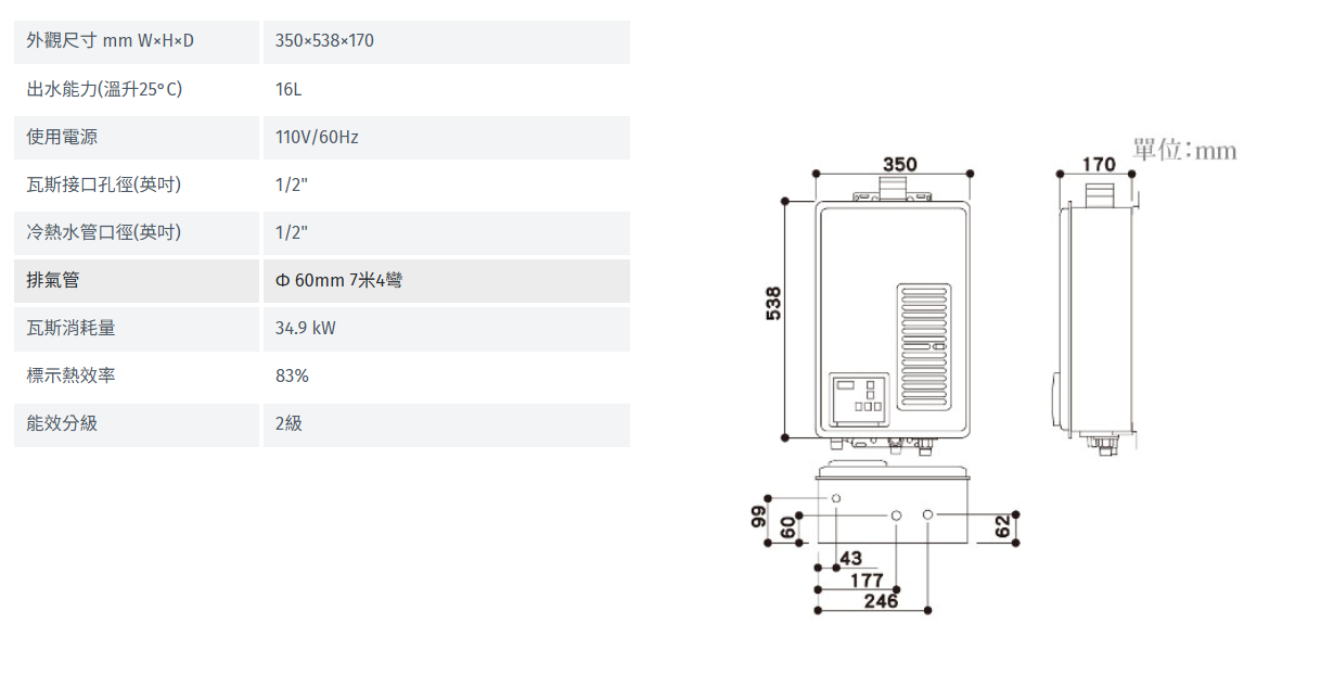 每分鐘熱水量製熱能力(溫升25度) 16L/min