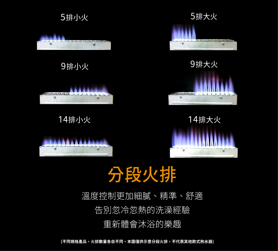 ●智慧恆溫火排分段功能(自動切換六排、九排及十五排火)自動微調火力大小,水溫不會忽冷忽熱,適合春夏秋冬季節使用
